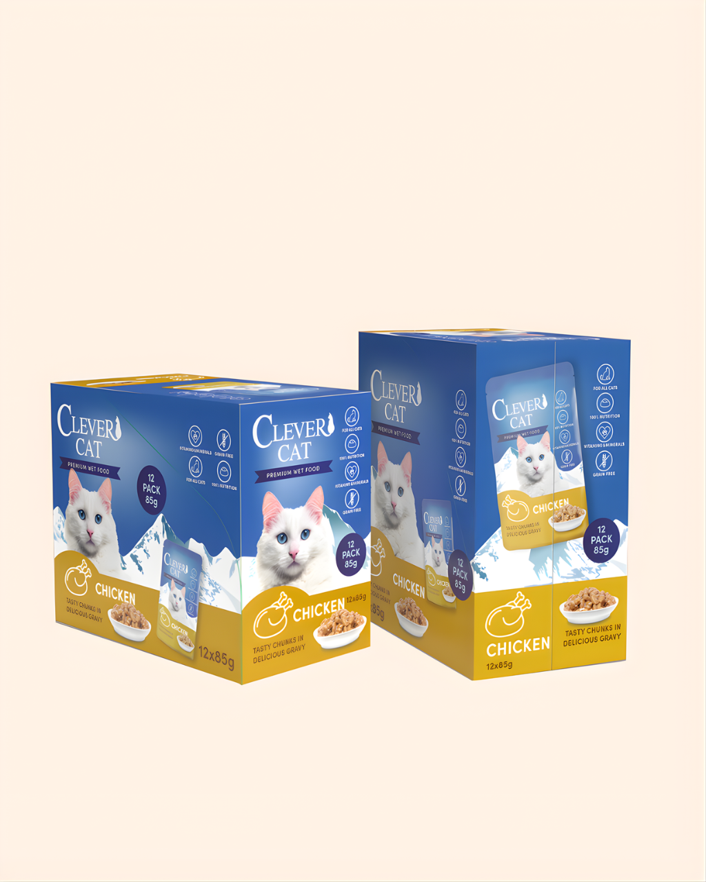 Clever Cat Premium Våtfoder med kycklingsmak är ett smakrikt och näringsrikt våtfoder som kombinerar mjuka bitar med en delikat sås. Det är framtaget för att ge din katt en komplett och njutbar måltid varje dag.