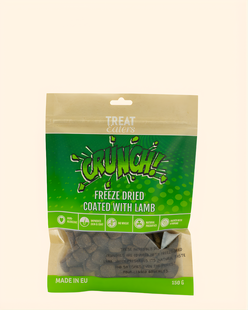 Dessa smakrika crunches är täckta med frystorkat lamm, en skonsam teknik som bevarar den naturliga smaken och gör godiset extra lockande även för kräsna hundar. Treateaters frystorkade snacks är packade i återvinningsbart material och kombinerar spröd crunch med naturliga ingredienser för en god och hållbar belöning.