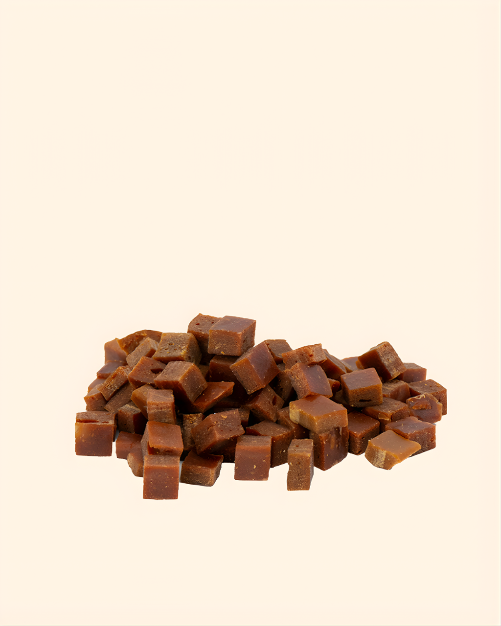 Lammkött, ank kött, vegetabiliskt glycerin, sorbitol, stärkelse, sojaprotein, salt, C-vitamin, kaliumsorbat.