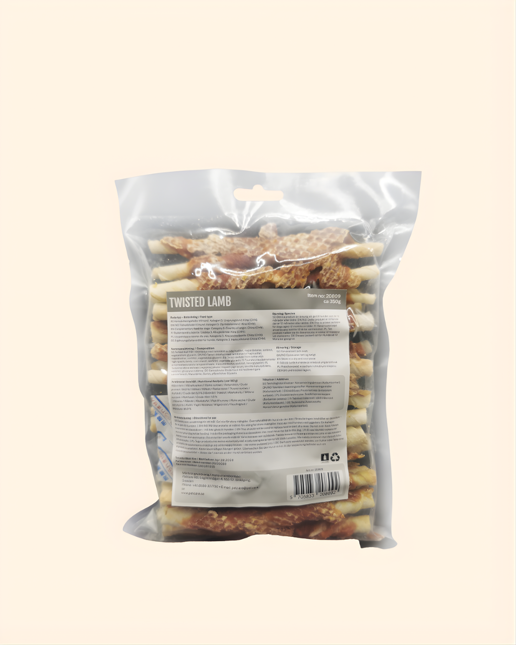 SE: Torkade råhudsremsor (råhud) 53 %, torkat lammkött 47 %