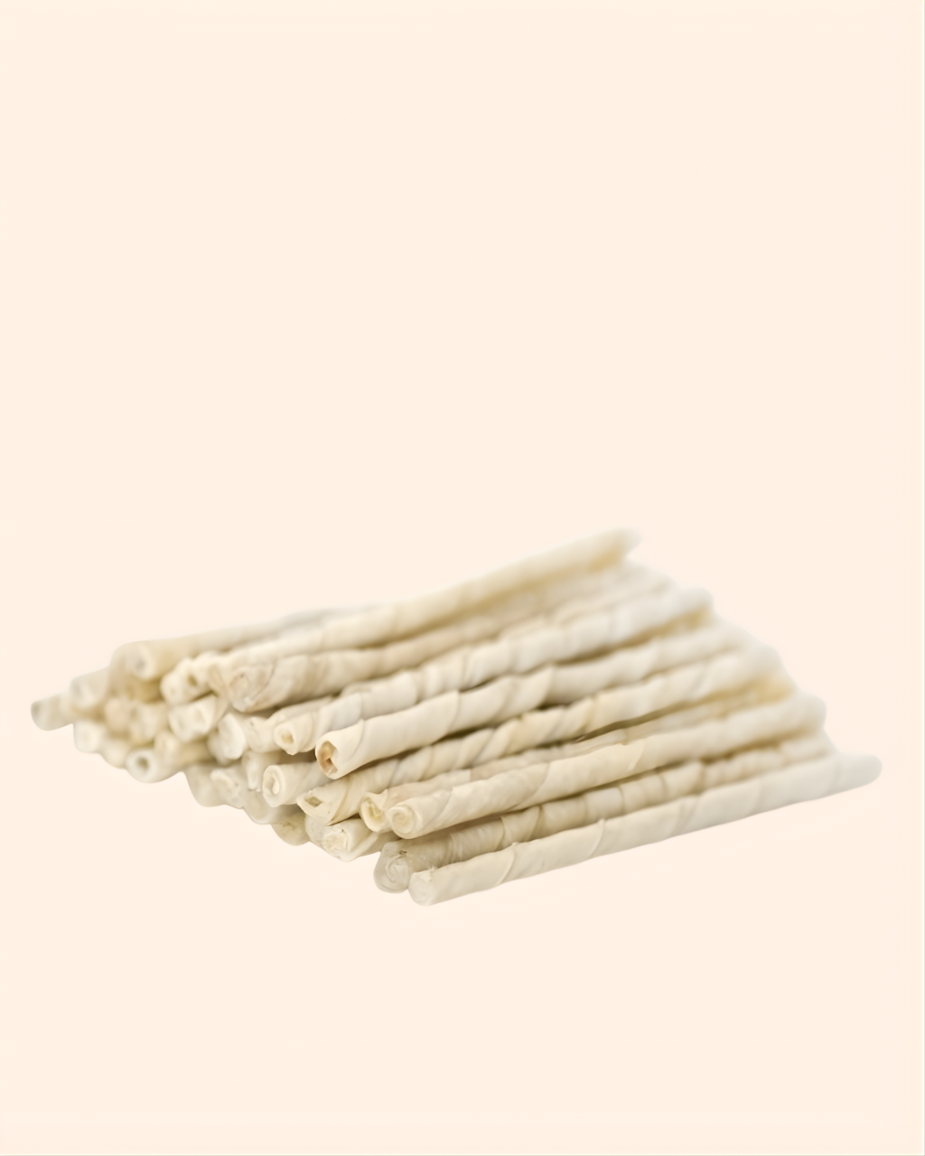 Vriden, smal tuggpinne av torkad hud av nötkreatur, extra skonsam för magen.