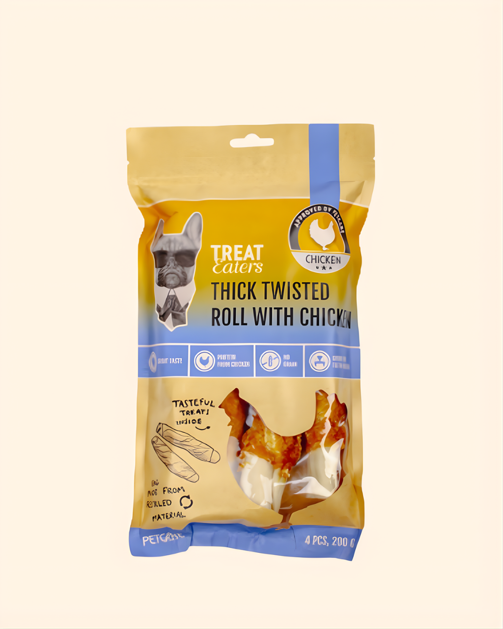 Dessa goda tuggrullar med kyckling är både smakrika och lätta för hunden att tugga. Perfekta som belöning eller som ett extra gott mellantugg. Rullarna levereras i en praktisk pappersförpackning.